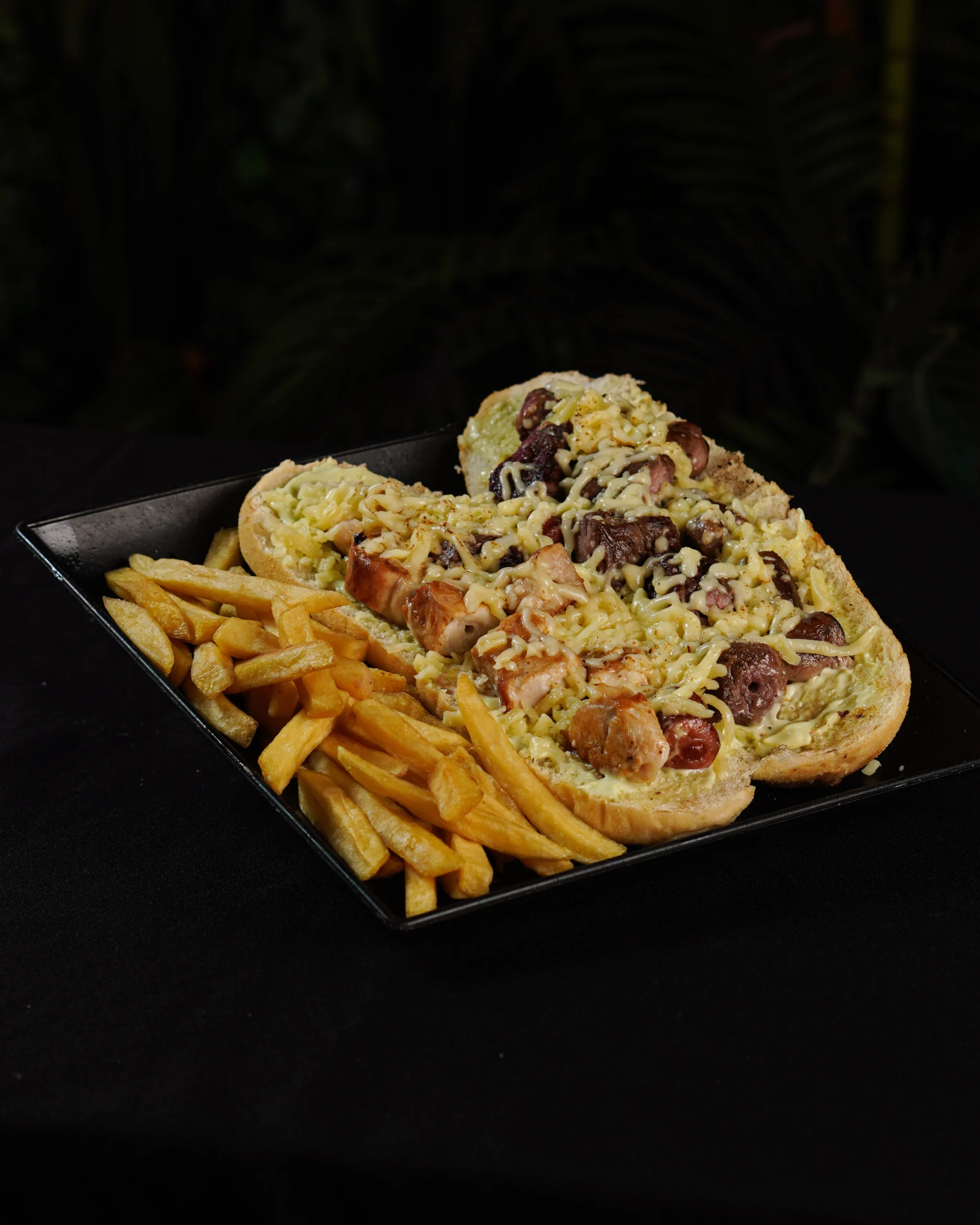 Um espeto clássico, maionese caseira, tomate, barbecue, mostarda, ketchup, queijo mussarela e batata frita